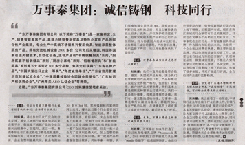 “廣東萬事泰集團有限公司(以下簡稱“萬事泰”)是一家集研發(fā)、生產(chǎn)、銷售智能家居產(chǎn)品、高端不銹鋼餐廚炊具及特色小家電產(chǎn)品的綜合性產(chǎn)業(yè)集團。專業(yè)生產(chǎn)高級不銹鋼餐廚炊具、智能家居整體廚房產(chǎn)品。擁有先進機械設(shè)備2000多臺,公司先后從德國、韓國等國家引進關(guān)鍵技術(shù)、自動化設(shè)備,主導產(chǎn)品有“不銹鋼餐廚具”系列、“廚房配套不銹鋼器皿”系列、“廚房小家電”系列、“鋁制餐廚具”系列等五大系列近800多個品種。集團先…