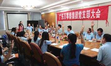 集團(tuán)訊 10月7日下午5時(shí)許,萬(wàn)事泰黨支部在集團(tuán)一樓會(huì)議室召開(kāi)廣東萬(wàn)事泰集團(tuán)黨支部大會(huì),集團(tuán)全體黨員參加了會(huì)議。會(huì)議由黨支部書(shū)記陳永錦和黨支部副書(shū)記、工會(huì)主席梁洪光共同主持。會(huì)上,梁洪光作會(huì)議主持人講話,闡明了這次黨支部大會(huì)議程分為三項(xiàng):第一、討論表決梁中興等六位同志按期轉(zhuǎn)為正式共產(chǎn)黨員;第二、討論表決鄧偉良等七位同志吸收為預(yù)備黨員;第三、討論確定廖巧玲等六位同志為發(fā)展黨員對(duì)象。會(huì)中,各預(yù)備黨員、…