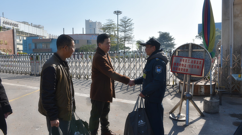 陳永錦一行先后慰問了萬事泰總部值班人員、員工宿舍值班人員、事業(yè)二部值班人員、嘉事泰工業(yè)園區(qū)值班人員等集團(tuán)員工。在嘉事泰工業(yè)園區(qū)內(nèi),陳煥文勉勵(lì)值班員工要盡心盡職,并詢問了春節(jié)期間安保管理工作,要求值班人員,加強(qiáng)巡查力度,確保新春期間廠區(qū)安全。隨后陳煥文與值班人員一同巡查廠區(qū),并指導(dǎo)了值班人員如何做好廠區(qū)安全工作,確保各項(xiàng)監(jiān)控設(shè)備的正常運(yùn)行。
