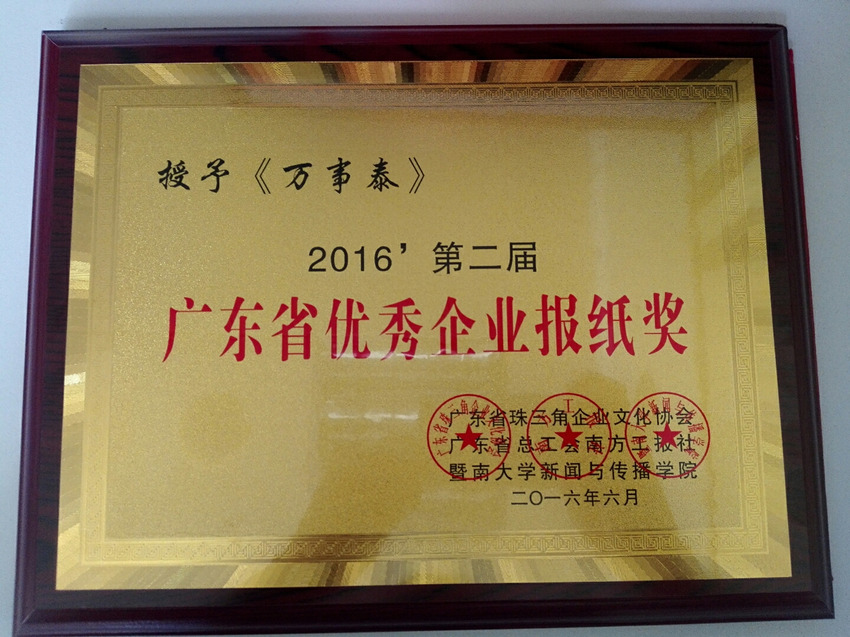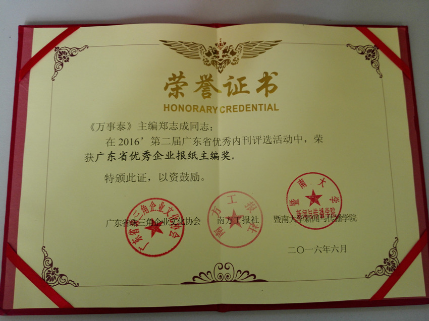 廣東省優(yōu)秀企業(yè)報(bào)紙獎(jiǎng)證書(shū)。