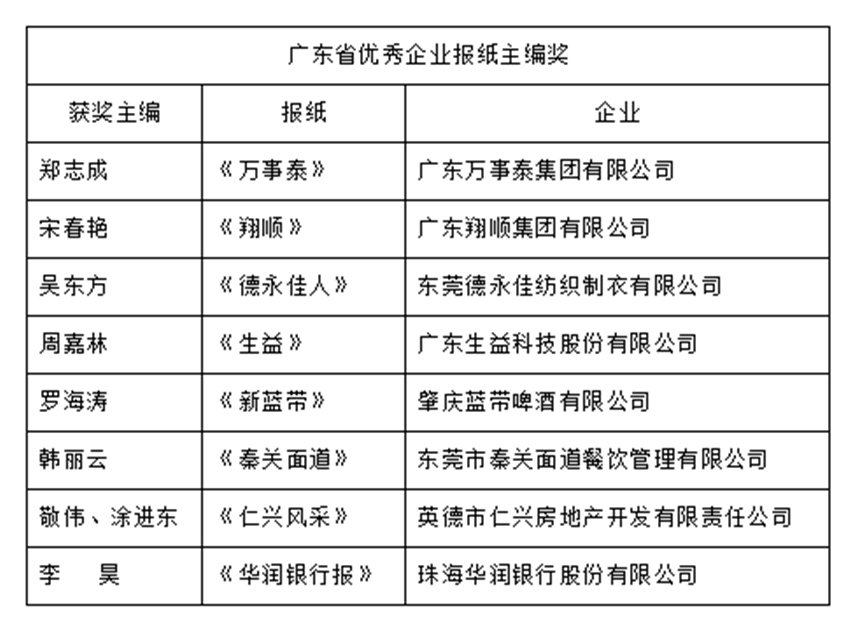 廣東省優(yōu)秀企業(yè)報(bào)紙主編獎(jiǎng)獲獎(jiǎng)名單。