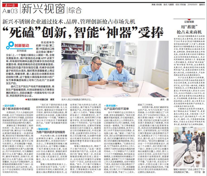 如今不銹鋼行業(yè)正在面臨大洗牌,競爭也更顯激烈?!艾F(xiàn)在對質(zhì)量要求越來越高,價位越來越低,這就只能從技術(shù)上入手降低成本。以前搞研發(fā)可以用幾套模具,可現(xiàn)在就是一套模具?!痹谌f事泰集團(tuán)技術(shù)中心總監(jiān)孔萌看來,技術(shù)中心的工作并不是每天坐在空調(diào)房、在電腦上畫一畫?!澳玫揭粋€新產(chǎn)品任務(wù),我們必須用最快的時間來完成。我們對質(zhì)量的要求近乎苛刻,再小的問題都會影響到銷售,所以設(shè)計時就如履薄冰?!笨酌雀嬖V記者,為了節(jié)省成本,技術(shù)中心工作人員想盡了各種辦法來延長模具的使用壽命。一個訂單要生產(chǎn)幾萬甚至十幾萬個不銹鋼鍋具,制作起來全靠模具,以前模具的材料硬度達(dá)不到要求,通常做了幾千個鍋具就要工作人員去修磨模具,無形中增加了成本?,F(xiàn)在他們對卷邊模進(jìn)行了處理,采用了PVD 工藝,表面硬度提高,可以做幾萬個不銹鋼鍋具再對其進(jìn)行修磨,節(jié)省了人工成本,提高了工作效率。