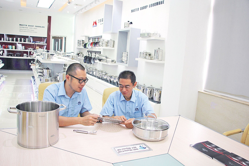 技術(shù)人員正對鍋具進(jìn)行研究討論。