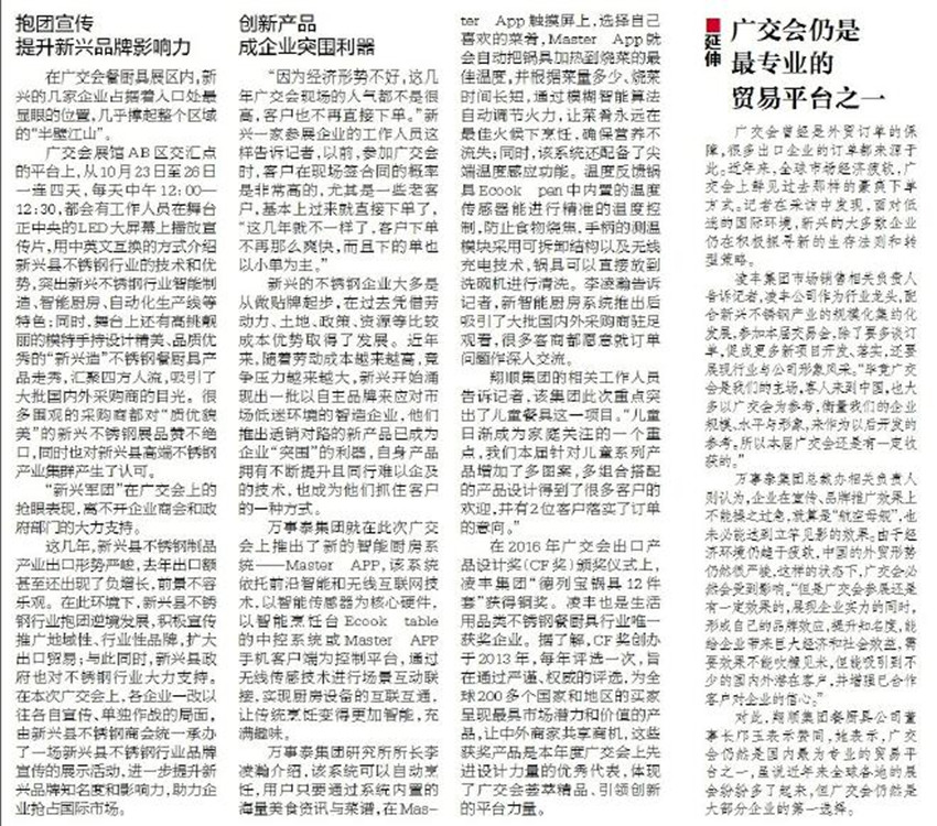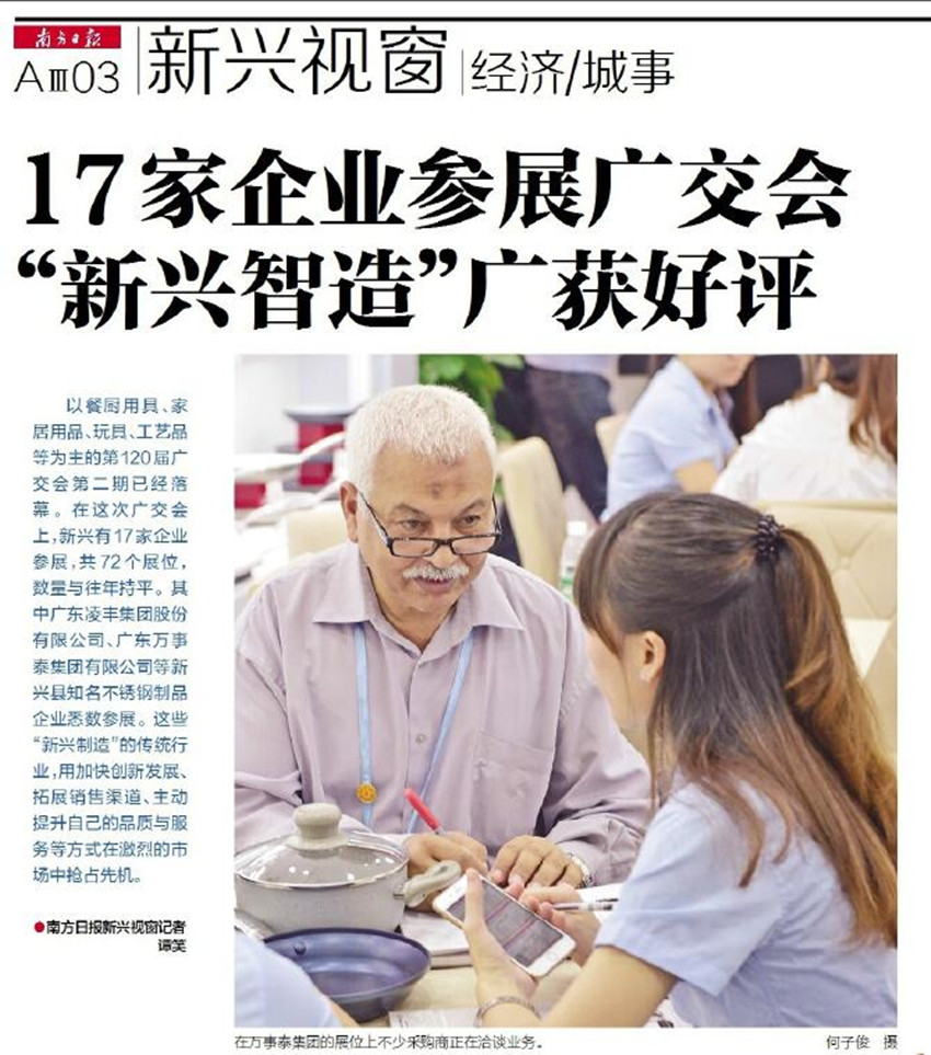 以餐廚用具、家居用品、玩具、工藝品等為主的第120屆廣交會第二期已經(jīng)落幕。在這次廣交會上,新興有17家企業(yè)參展,共72個展位,數(shù)量與往年持平。其中廣東凌豐集團(tuán)股份有限公司、廣東萬事泰集團(tuán)有限公司等新興縣知名不銹鋼制品企業(yè)悉數(shù)參展。這些“新興制造”的傳統(tǒng)行業(yè),用加快創(chuàng)新發(fā)展、拓展銷售渠道、主動提升自己的品質(zhì)與服務(wù)等方式在激烈的市場中搶占先機(jī)。