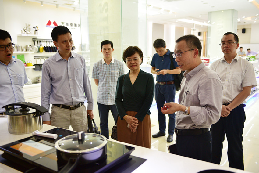 隨后,調(diào)研組一行來到了萬事泰智能廚房展廳。參觀期間,劉炳耀詳細(xì)介紹了集團(tuán)的廚具產(chǎn)品和小家電產(chǎn)品。萬事泰研究所經(jīng)理何榮佳向調(diào)研組一行講解了萬事泰自主研發(fā)的智能烹飪臺(tái)E-cook table和帶有溫度傳感器的不粘鍋,為調(diào)研組一行展示了萬事泰科技創(chuàng)新轉(zhuǎn)型升級的新產(chǎn)品和新方向。調(diào)研組對萬事泰智能廚房非常感興趣,都紛紛給予了充分的肯定。其中,王月琴還深入了解萬事泰的新產(chǎn)品研發(fā)方向、理念以及車間自動(dòng)化生產(chǎn)情況兩方面內(nèi)容。