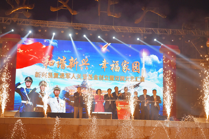 領(lǐng)導(dǎo)們?nèi)w手扶拉桿,在市委副書記、政法委書記袁錦權(quán)宣布:新興縣復(fù)退軍人關(guān)愛基金正式創(chuàng)立”聲音中同時推下拉桿,燃放煙花,噴起噴泉。