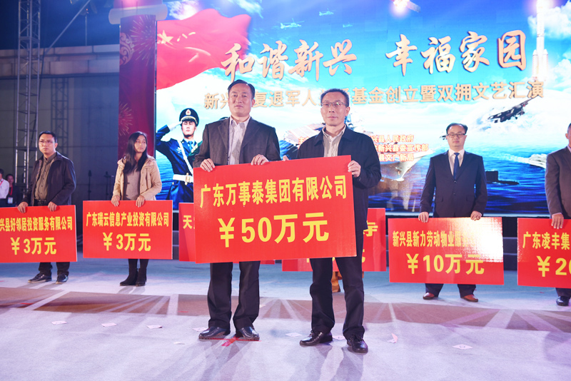 集團(tuán)訊 1月5日晚上,在新興縣文化廣場隆重舉行了新興縣復(fù)退軍人關(guān)愛基金創(chuàng)立暨雙擁文藝匯演。市委副書記、政法委書記袁錦權(quán),市人大常委會副主任梁錦波,副市長鐘漢謀、市政協(xié)副主席王莉莉,縣委書記唐誼,縣委副書記、縣長梁子財,縣人大主任梁錦釗,縣政協(xié)主席梁國華、萬事泰集團(tuán)常務(wù)副總裁劉炳耀等愛心企業(yè)家出席了此次盛會。