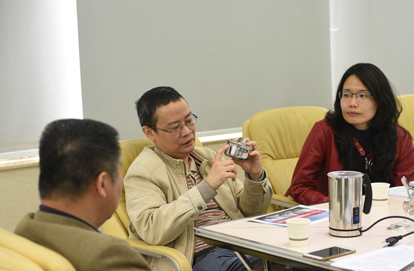 劉總給調(diào)研團(tuán)講解產(chǎn)品工藝特點(diǎn)