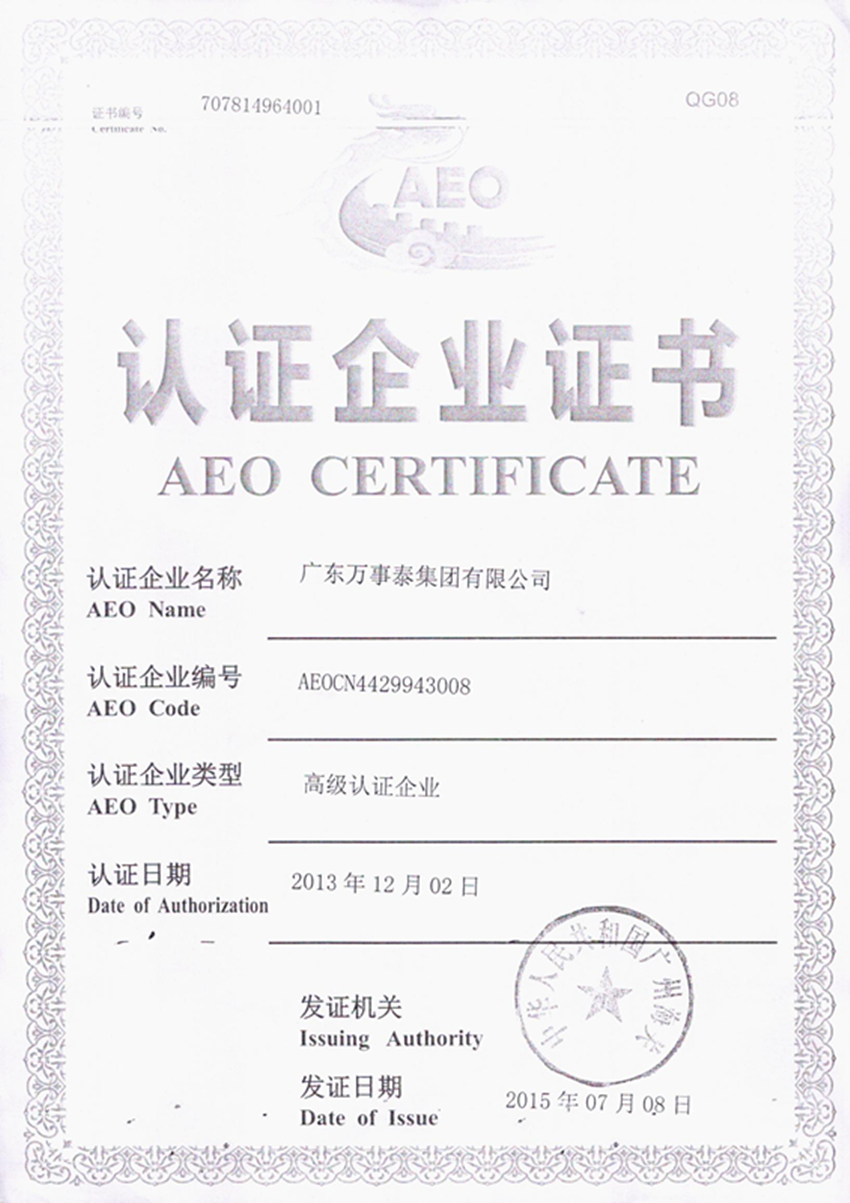 集團(tuán)訊 近日,萬事泰集團(tuán)順利通過海關(guān)AEO(即Authorized Economic Operator,簡稱“經(jīng)認(rèn)證經(jīng)營者”)高級認(rèn)證、成為獲得國際貿(mào)易最高等級“信用通行證”的企業(yè)。