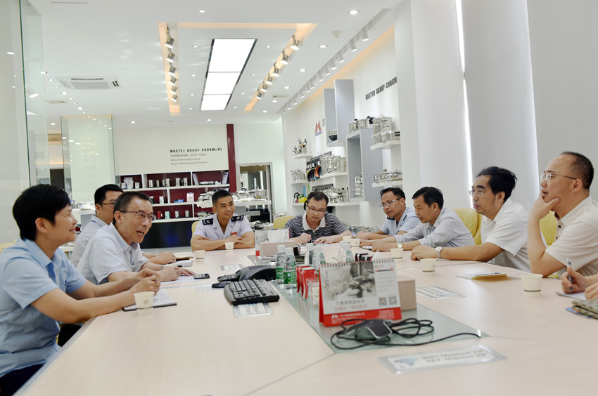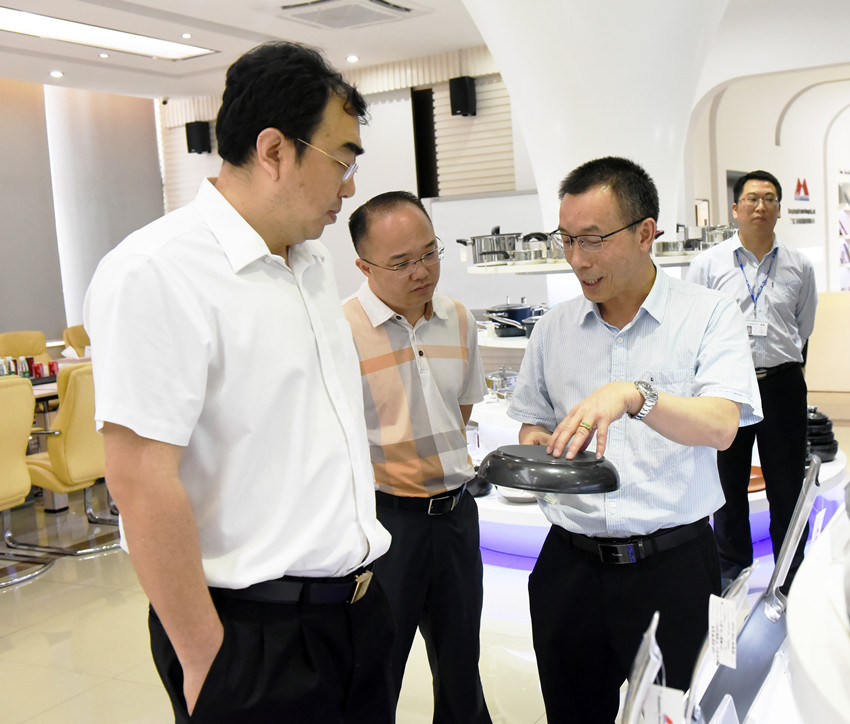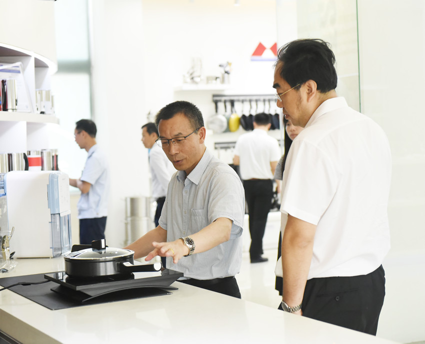 調(diào)研團(tuán)一行先后來到全景廠區(qū)沙盤模型、四樓智能餐廚具產(chǎn)品展示廳,劉總向大家介紹了榮獲德國紅點獎的智能微壓鍋、廣交會上備受關(guān)注的智能健康大廚房等系列產(chǎn)品。調(diào)研團(tuán)對萬事泰集團(tuán)近年來在轉(zhuǎn)型升級的道路上收獲到的累累碩果表示贊嘆不已。