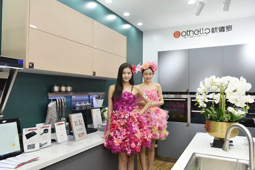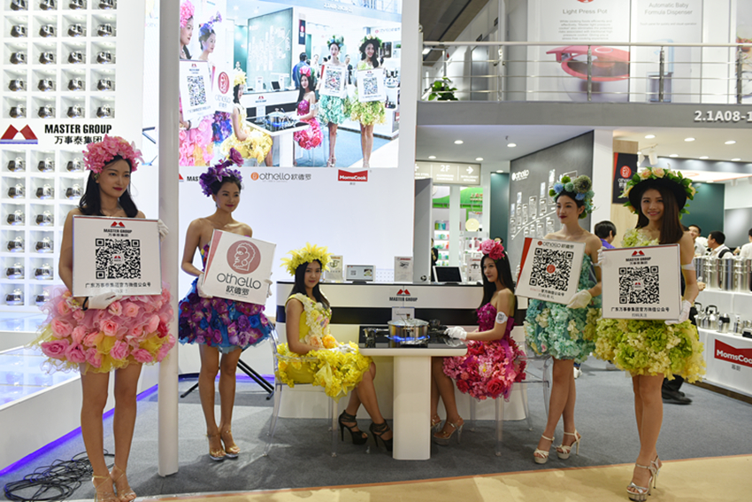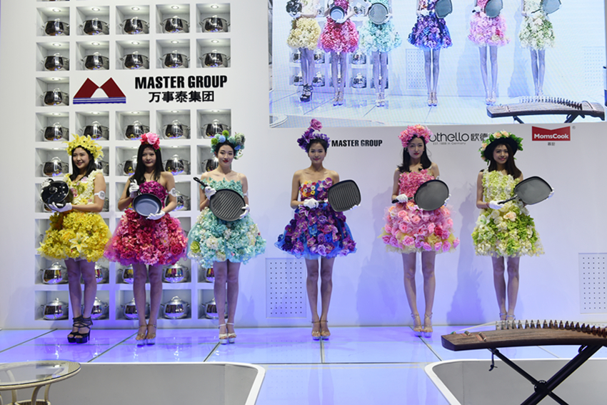 美女模特正在向參展商展示高端不銹鋼餐具