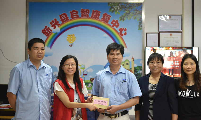萬(wàn)事泰集團(tuán)代表人員慰問(wèn)新興縣啟智學(xué)校與溫校長(zhǎng)合影留念