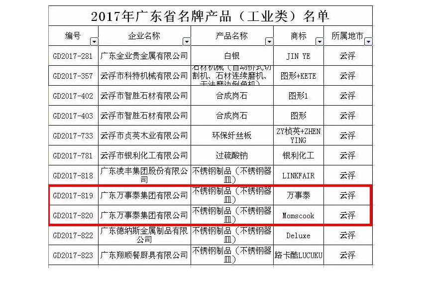 集團訊 日前,“2017年度廣東省名牌產(chǎn)品”名單正式公布。廣東萬事泰集團旗下品牌萬事泰、Momscook慕廚產(chǎn)品,在眾多品牌的角逐中脫穎而出,榮膺“廣東省名牌產(chǎn)品”稱號。