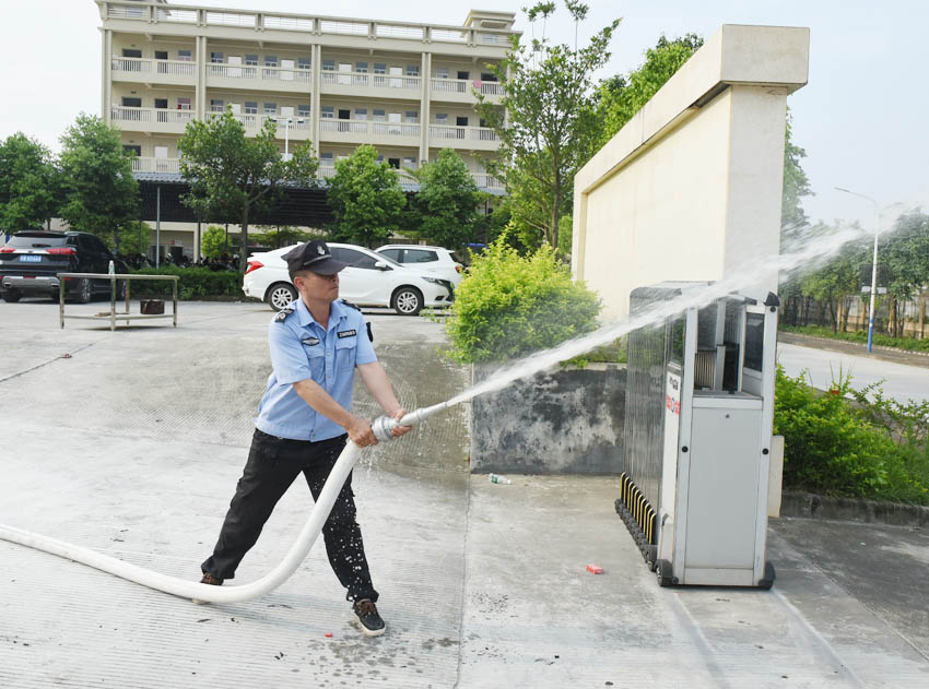 現(xiàn)場工作人員演示消防栓、水槍的使用