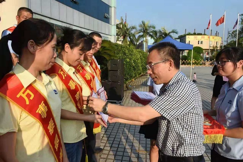 萬(wàn)事泰常務(wù)副總裁劉炳耀現(xiàn)場(chǎng)派發(fā)榮譽(yù)大紅包,榮譽(yù)員工們喜笑顏開(kāi)