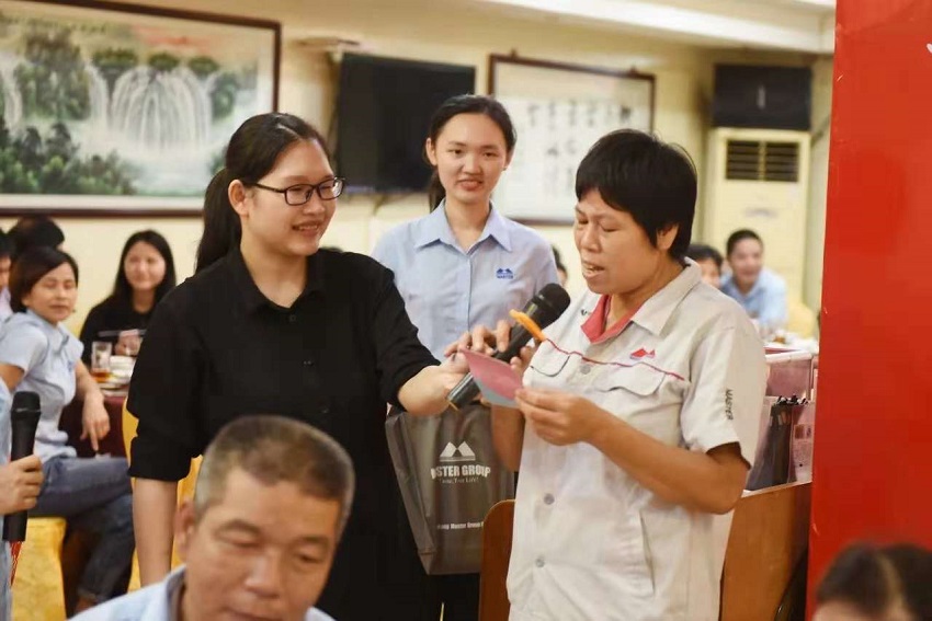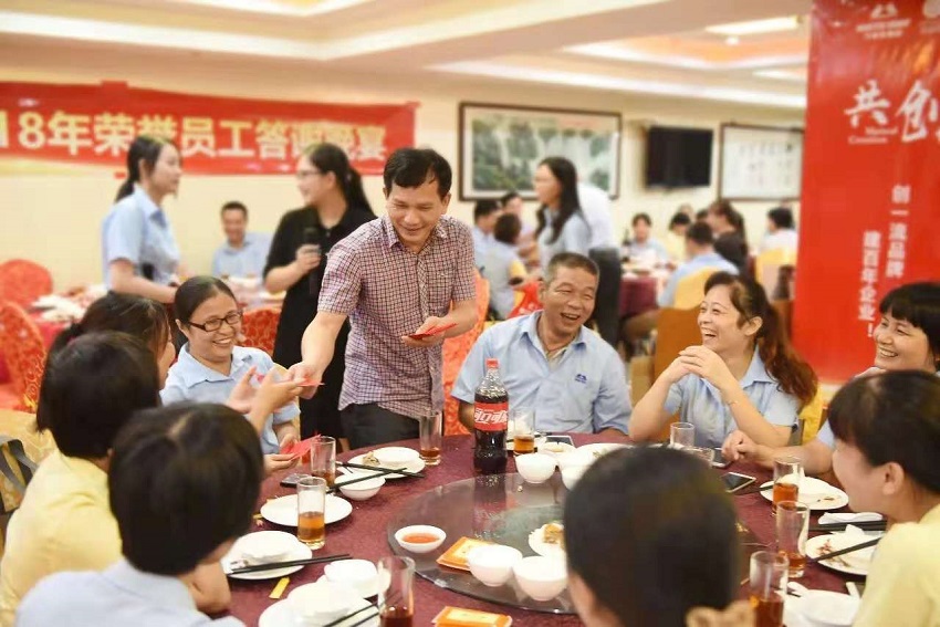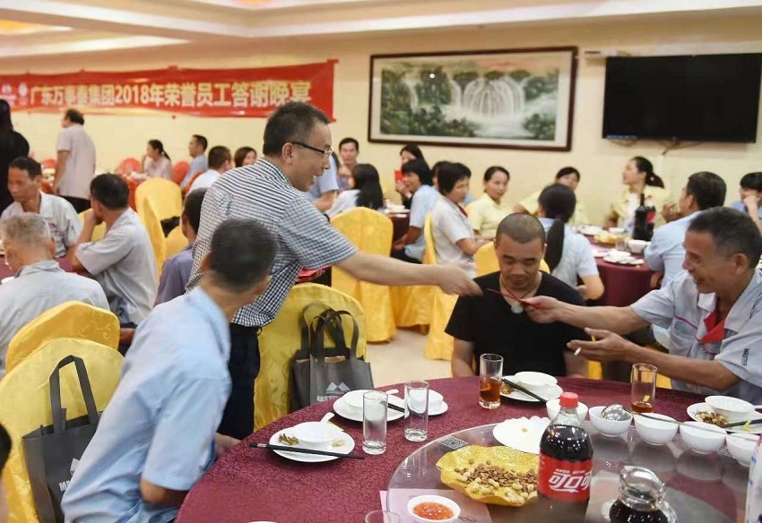 萬(wàn)事泰董事長(zhǎng)梁桂泉現(xiàn)場(chǎng)派發(fā)榮譽(yù)大紅包,榮譽(yù)員工們喜笑顏開(kāi)
