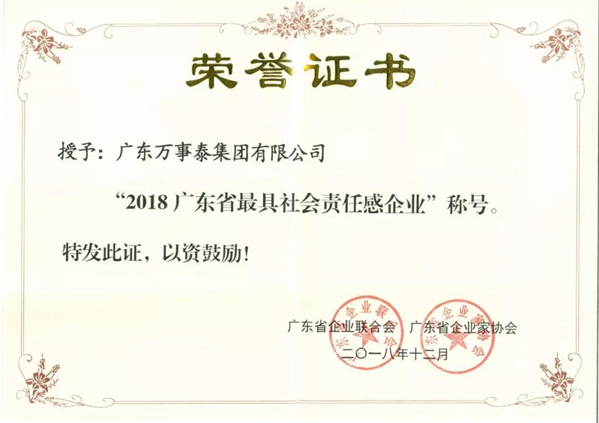 集團(tuán)訊 12月20日,由廣東省企業(yè)聯(lián)合會、廣東省企業(yè)家協(xié)會主辦的主題為“弘揚(yáng)優(yōu)秀企業(yè)家精神,爭當(dāng)新時(shí)代高質(zhì)量發(fā)展的排頭兵”的2018廣東企業(yè)家年會在廣州隆重舉行。發(fā)布會上,萬事泰集團(tuán)等多家企業(yè)被授予“2018廣東省最具社會責(zé)任感企業(yè)”榮譽(yù)稱號。
