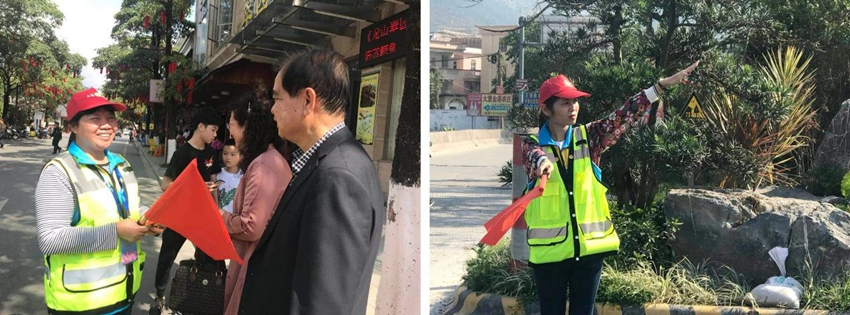 春節(jié)期間景區(qū)交通流量成倍增加,萬事泰志愿者團(tuán)隊(duì)身穿紅馬甲、手拿小紅旗,在交通崗上引導(dǎo)司機(jī)和行人按照路況安排行進(jìn),還有志愿者分散在周圍路口,揮動(dòng)小旗、吹著哨,進(jìn)行交通引導(dǎo),協(xié)助交警維持交通秩序,全天候地開展景區(qū)秩序維護(hù)、安全疏導(dǎo)、協(xié)調(diào)幫助等志愿服務(wù)工作。