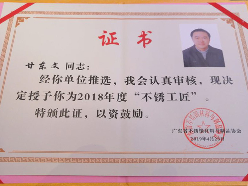 集團訊 4月26日,由廣東省不銹鋼材料與制品協(xié)會黨支部、廣東省不銹鋼材料與制品協(xié)會主辦的2018年度“不銹工匠”表彰大會在佛山市皇冠假日酒店隆重舉行。廣東萬事泰集團事業(yè)一部工程科甘東文喜獲“不銹工匠”稱號。據(jù)悉,這次評選經(jīng)過了嚴格的組織評定、公示等程序,從中選出具有技術性、先進性和代表性的“不銹工匠”。甘東文在生產(chǎn)車間勤懇工作,以嚴格的標準要求自己。他詮釋了基層技術管理人員“干一行、愛一行、專一行、精一行”的工匠精神,也給萬事泰集團的廣大員工樹立了學習的榜樣。