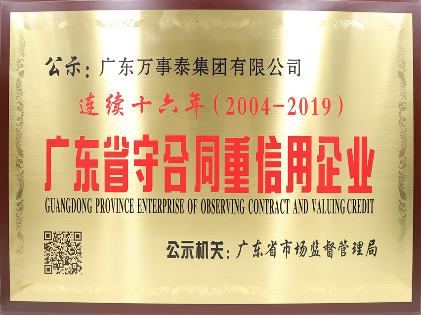 萬事泰集團(tuán)連續(xù)十六年獲“廣東省守合同重信用企業(yè)”稱號(hào)