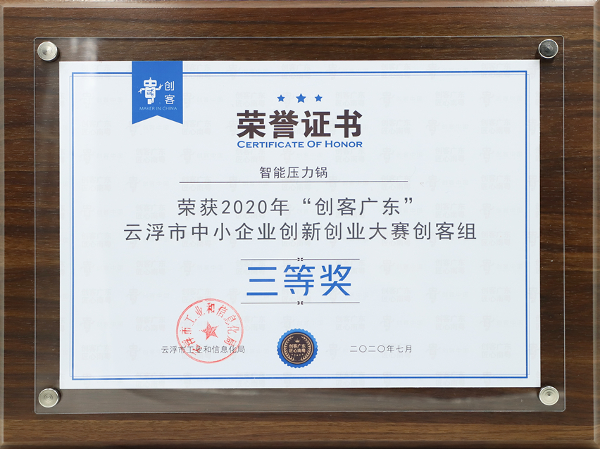 集團(tuán)訊 近日,由云浮市工業(yè)和信息化局主辦,新興縣人民政府、新興縣創(chuàng)新中心承辦的2020年“創(chuàng)客廣東”云浮市中小企業(yè)創(chuàng)新創(chuàng)業(yè)大賽頒獎(jiǎng)儀式暨創(chuàng)客巔峰會(huì)在云浮市新興縣隆重舉行。經(jīng)過激烈的角逐,廣東萬事泰集團(tuán)有限公司的“智能壓力鍋”項(xiàng)目榮獲創(chuàng)客組三等獎(jiǎng)。