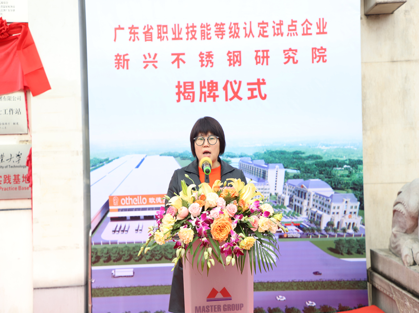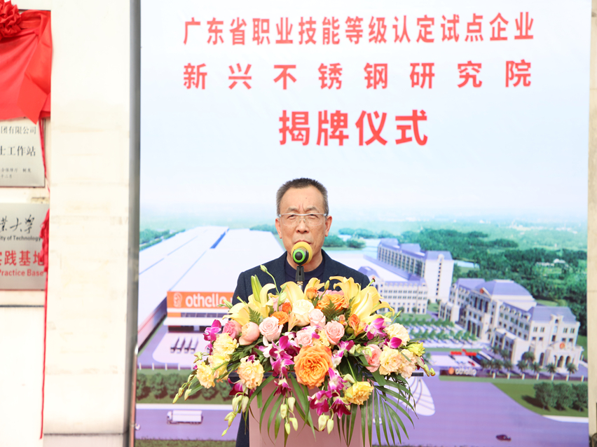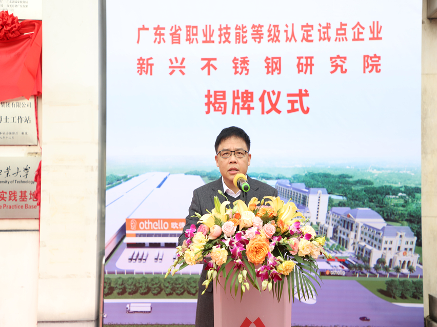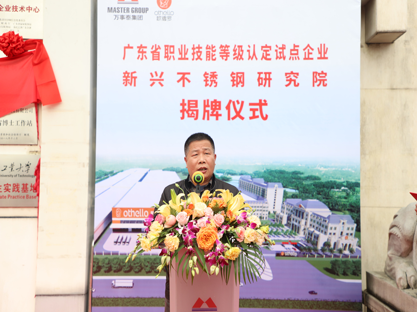 萬事泰集團執(zhí)行總裁劉炳耀首先向在百忙中抽空出席本次儀式的領導、嘉賓表示歡迎和感謝。他表示,“順利申報成為廣東省職業(yè)技能等級認定試點企業(yè),以及成立新興不銹鋼研究院是萬事泰集團向著高質(zhì)量發(fā)展的兩項重要標志。作為云浮唯一的職業(yè)技能等級認定試點企業(yè),我們將持續(xù)加強認定工作的科學化、規(guī)范化,進一步提升企業(yè)技能人才的水平,助力云浮、新興的技能人才隊伍建設發(fā)展。同時,承載著各級領導和社會各界的支持、關懷,新興不銹鋼研究院落戶萬事泰集團,這是對萬事泰研發(fā)實力的認可,也是對萬事泰的期望,我們將以此為鞭策,充分發(fā)揮研究院的能動性,加快企業(yè)創(chuàng)新升級,以點帶面,促進行業(yè)的創(chuàng)新發(fā)展,為新興不銹鋼餐廚具產(chǎn)業(yè)的轉(zhuǎn)型升級凝聚核心競爭力作出積極貢獻?!?