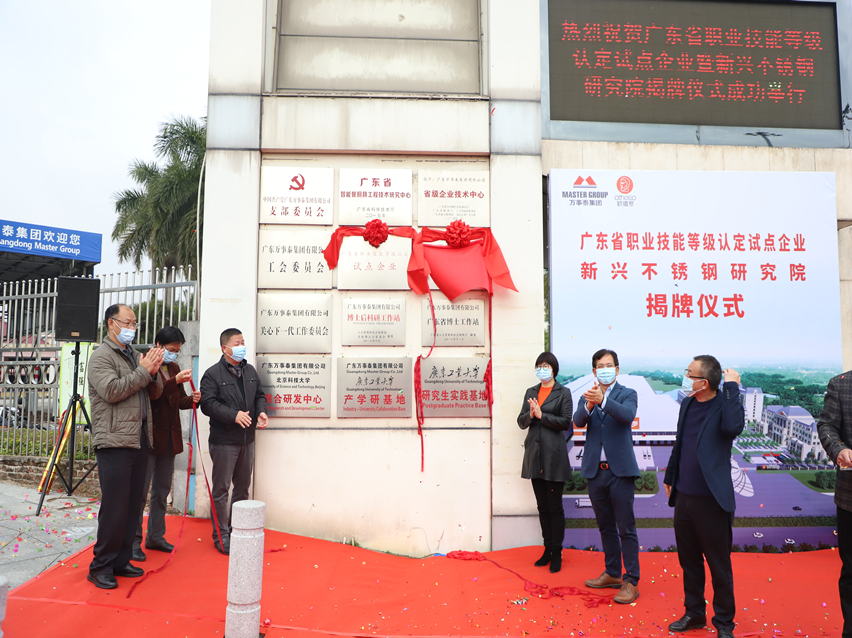 集團訊 1月22日上午,萬事泰集團舉行了廣東省職業(yè)技能等級認定試點企業(yè)暨新興不銹鋼研究院揭牌儀式。云浮市科學技術局、市人力資源和社會保障局與新興縣人民政府等機關單位領導,新興縣不銹鋼商會及其會員企業(yè)代表共同見證了這富有意義的時刻,萬事泰集團董事長梁桂泉、執(zhí)行總裁劉炳耀等集團領導出席了儀式。儀式由新興不銹鋼研究院院長陳健主持。萬事泰集團中心級部門負責人參加活動。