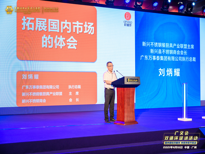 集團訊 4月16日,由中國對外貿易中心、廣東省商務廳主辦的“國內國際雙循環(huán)、內貿外貿齊驅動——第129屆廣交會雙循環(huán)促進活動”在廣交會展館成功舉辦。萬事泰集團作為廣交會品牌企業(yè)和CF獎企業(yè),攜旗下歐德羅品牌代表產品參加了本次活動,萬事泰集團執(zhí)行總裁劉炳耀受主辦方邀請出席活動,并就如何拓展國內市場作實踐經驗分享。