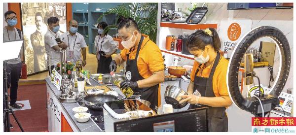 廚具參展商在展位現(xiàn)場(chǎng)直播用自家廚具做菜。 南都記者 譚慶駒 攝