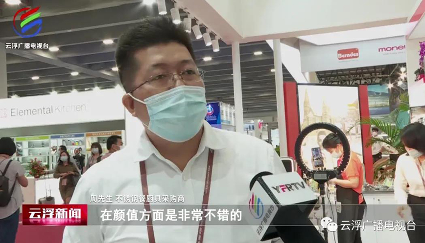 黃志榮:“這是我們最新推出的壓力鍋,它獲得了廣東第130屆進出口產(chǎn)品的設計獎金獎,是云浮市唯一獲得金獎的產(chǎn)品,主要有幾個特點:一是它有六重的安全裝置,第二是它可以節(jié)省百分之三十的能源。這次我們總共帶來了200到300款產(chǎn)品,主要以不銹鋼的餐廚具為主,還有鋁制的烘培類的產(chǎn)品和小家電,著力打造一個餐廚用品的一站式采購基地?!?