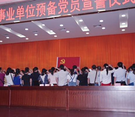 新黨員在主席臺(tái)上的黨旗前,舉起右手,在領(lǐng)誓人的領(lǐng)誓下宣讀入黨誓言?!拔抑驹讣尤胫袊?guó)共產(chǎn)黨,擁護(hù)黨的綱領(lǐng),遵守黨的章程,履行黨員義務(wù)……”會(huì)場(chǎng)響起整齊響亮的誓言。